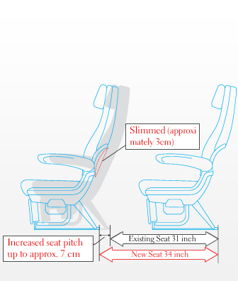 Front clearance of each seat will be expanded to 34 inches (from 31 inches).The seats are slimmer too.