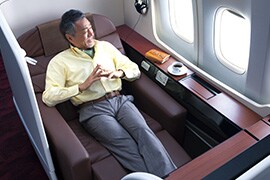 ベッドポジションは、完全フルフラットを採用。またストレスのない全席通路アクセスにより、自由で快適にお過ごしいただけます。