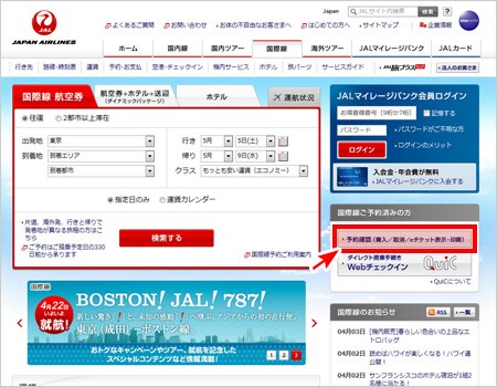 JAL国際線トップページの「国際線ご予約済みの方」から「予約確認(購入/取消/eチケット表示・印刷)」をクリックしてください。