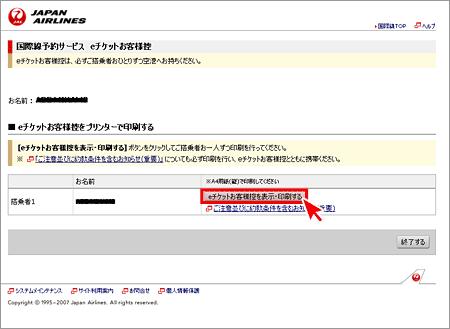 印刷を希望する搭乗者の「eチケットお客様控を表示・印刷する」ボタンをクリックしてください。