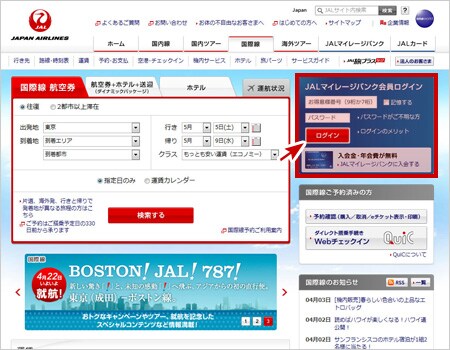 JALトップページより、「会員専用ページ」にログインします。