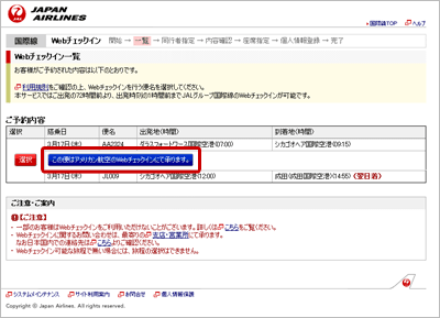 アメリカン航空から日本航空へお乗り継ぎのお客さま<既に日本航空運航便の事前座席指定をお済ませの場合> [この便はアメリカン航空のWebチェックインにて承ります]という青いボタンをクリックするとアメリカン航空のウェブサイトへ移動し、アメリカン航空運航便のWebチェックインとともに、既に事前座席指定されている日本航空運航便の搭乗券も印刷が可能です。 <新たに日本航空運航便の座席を指定される、または事前座席指定を変更される場合> 赤い[選択]ボタンをクリックし、始めに日本航空運航便のWebチェックインを行ってください。 注)先にアメリカン航空運航便のWebチェックインを行った場合は、日本航空運航便の座席指定や事前座席指定の変更はできず、システムにより自動的に座席指定が行なわれます。 |