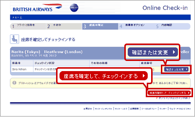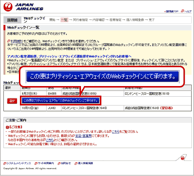 注)先にブリティッシュ・エアウェイズ運航便のWebチェックインを行った場合は、日本航空運航便の座席指定や事前座席指定の変更はできず、システムにより自動的に座席指定が行なわれます。