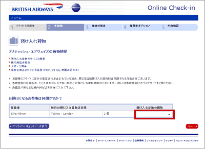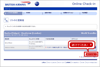 [この便はブリティッシュ・エアウェイズのWebチェックインにて承ります]という青いボタンをクリックするとブリティッシュ・エアウェイズのウェブサイトへ移動し、ブリティッシュ・エアウェイズ運航便のWebチェックインとともに、既に事前座席指定されている日本航空運航便の搭乗券も印刷が可能です。