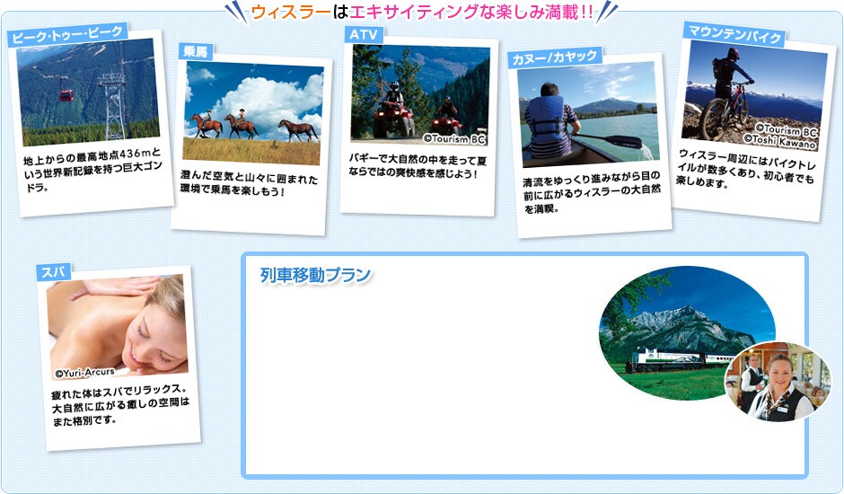 バンクーバーから車で約2時間の高原リゾート。スキーリゾートとして世界的に有名なウィスラーは、実は夏もエキサイティング!!幅広い年齢層を惹きつけるバラエティー豊かなアクティビティで自然いっぱいのウィスラーを遊びつくそう!