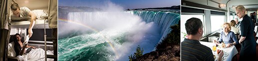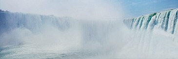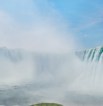 約675mにわたって美しくカーブを描くカナダ滝。東京ドームを約7分でいっぱいにするほどの水量が落ちるさまは迫力満点!「霧の乙女号」に乗船します。そしてワイン産地でもあるナイアガラならではのワイナリーランチも満喫!
