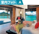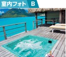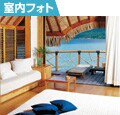 広々としたリビングとベッドルームに分かれたスイートルーム。ポリネシアンスタイルの内装、高級感と情緒が漂う家具、大理石のバスルームが魅力。プレミアム水上ヴィラのテラスにはジャグジーも。