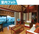 天井が高く開放感があり、快適さを追求したお部屋。テラスから一望できるラグーンに、沈む夕日は絶景です。