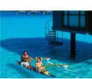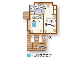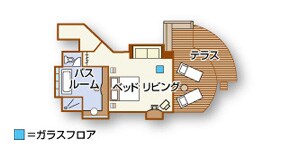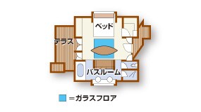 南国気分を演出する遊び心あるお部屋。2m四方の巨大なガラス板の床を通して、熱帯魚の海を眺められ、海の上で過ごす気分を満喫できます。