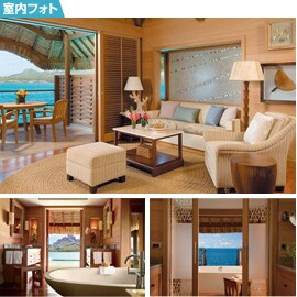 天蓋付きベッドや、大理石造りのバスルーム、広々としたテラスなど、タヒチ伝統の建物を優雅に再現したゆとりの空間で、贅沢な時間を過ごせます。