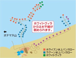 透けるような遠浅のラグーンに建ち並ぶ、プライベートタイムを重視した1棟独立型のバンガロー。ひっそりとした静寂の中で唯一聞こえ続ける波の音が、くつろぎの空間を作り出しています。