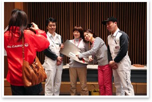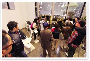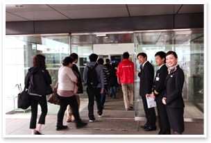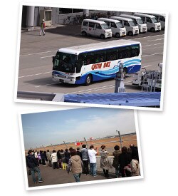 成田空港第二ターミナルから3台のバスに分かれ会場に到着すると、JALカード代表取締役社長 岡田をはじめ、スタッフが参加者の皆さまをお出迎え。