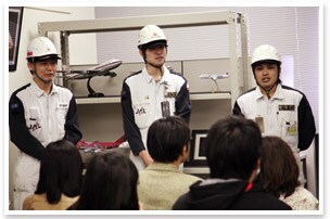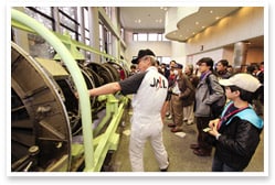 もうひとつの会場であるエンジンメンテナンスセンターの1階では、大きなエンジンなどの展示物を前に、整備士がそれぞれの部品の構造を解説。
