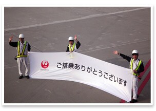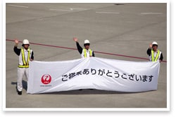 セントレアへ到着し窓の外を見ると、整備士が「ご搭乗ありがとうございます」の横断幕を持って、手をふっています!このお出迎えに、参加者の皆さまは大喜び!