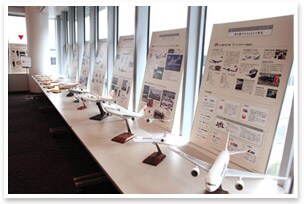 「JALの歴史」をご紹介するパネルをはじめ、初代からの客室乗務員の制服、ファーストクラス搭乗記念品の扇子などを展示。