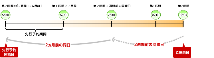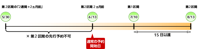先行予約サービスは第1区間、第2区間が2週間以内のご旅程が対象となります。