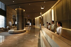 22階建てのホテルはクラシカルな雰囲気を保ちつつ、スタイリッシュな外観を示しています。エントランスホールをはじめ、客室内も淡いグレーやブラウンのアースカラーで統一され、落ち着いた空間を形成しています。きっと表通りの喧騒とのギャップに安堵感を覚えるはずです。