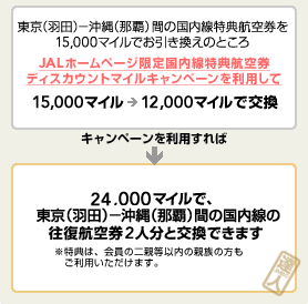 キャンペーンを利用すると、各種特典がさらにおトクに交換できます。通常よりも少ないマイル数で特典と交換できたり、おとも de マイル割引キャンペーンなどは、本人だけでなく、ご同行者も割引運賃でご搭乗できます。