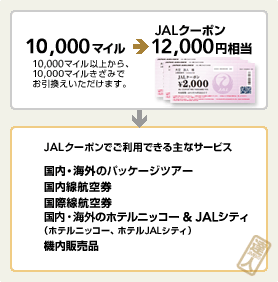JALグループの航空券や、国内・海外のパッケージツアーだけでなく、機内販売品・機内免税品、国内・海外のJALホテルズ(ホテルニッコー、ホテルJALシティ)でのお支払いにご利用いただけるおトクなクーポン券です。