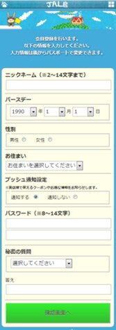 - [4] ニックネーム、生年月日、性別、お住まい、プッシュ通知設定、パスワード、秘密の質問を入力し、【確認画面へ】をタップします。