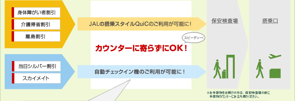 次回搭乗時から、JAL/JMBカード(IC機能付)、JAL ICポケットアプリダウンロード初期設定済みおサイフケータイ®をお持ちいただくと、タッチ&ゴーにてご搭乗が可能です。