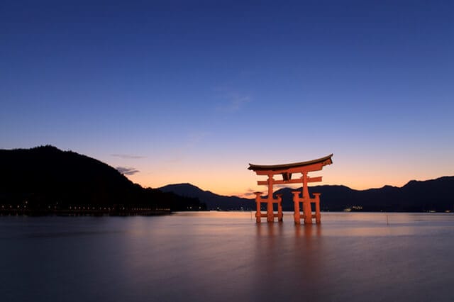 海上に建つ朱色の社殿や大鳥居が神秘的な信仰の地。建造物の多くは国宝・重要文化財に指定され、1996年12月に世界文化遺産に登録されました。