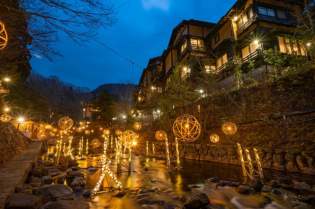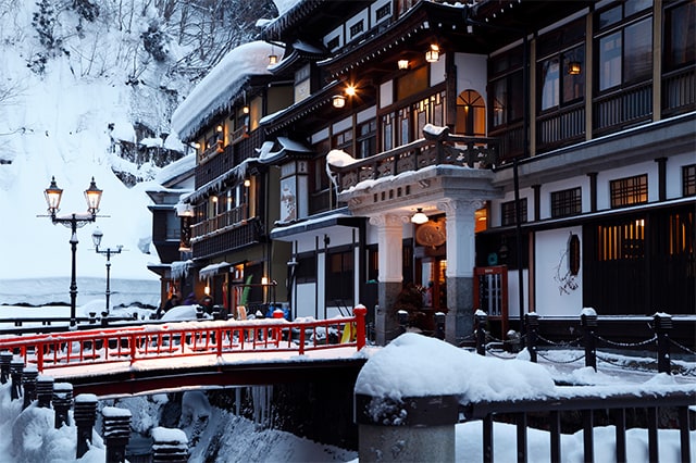 山形県尾花沢市にある、大正ロマンの雰囲気が漂う美しい温泉地です。冬には、雪景色と温泉情緒が相まって、まさに絵のような美しさです。