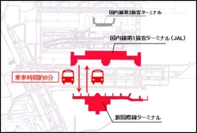 地下トンネルを利用して国内線と国際線のターミナルをJAL専用バスで繋ぎます