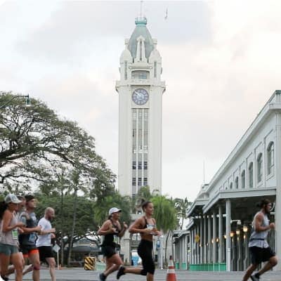 ホノルル港のシンボルとして、昔から親しまれてきたアロハタワー。コース上には歴史的・文化的な名所もたくさんあって、マラソンしながら観光気分。
