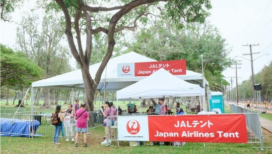 JALハワイ線にご搭乗いただき、ハワイズハーフマラソン ハパルアに参加される方のために、大会当日カピオラニ公園内に「JALテント」をご用意いたします。ゴール後の休憩にぜひご活用ください。テント内には、水・ドリンク類、紙おしぼり、冷却用アイス、フルーツなどをご用意しております。