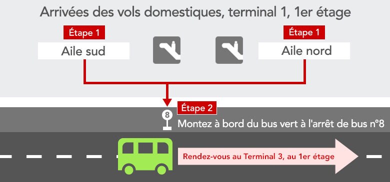 - *Certains bus ne vont pas au terminal 3. Veuillez vous assurer de prendre le bon bus.