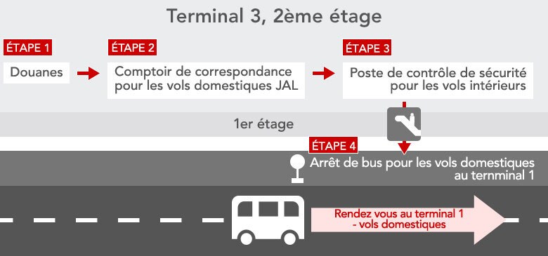 - Les passagers enregistrés pour leur vol intérieur JAL et n'ayant aucun bagage à enregistrer n'ont pas besoin de passer par le comptoir des transferts. Veuillez prendre la navette jusqu'au terminal 1.
