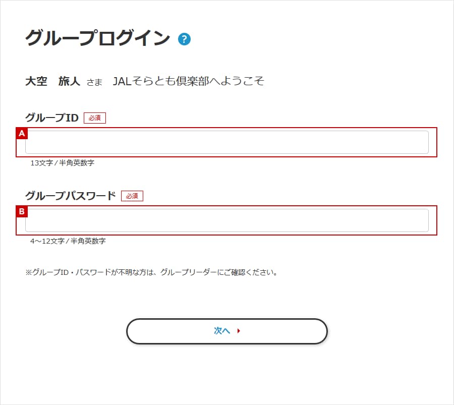 「グループ作成完了のお知らせ」メールに記載されているグループID・パスワードを入力します。