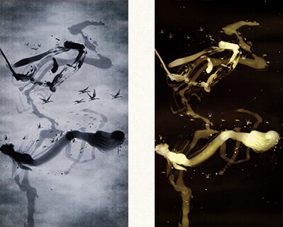 Title: Kusho – Writings in the Air: Reversible Rotation in Black and White with Cranes – Fukuoka, Gold Light, Day and Night