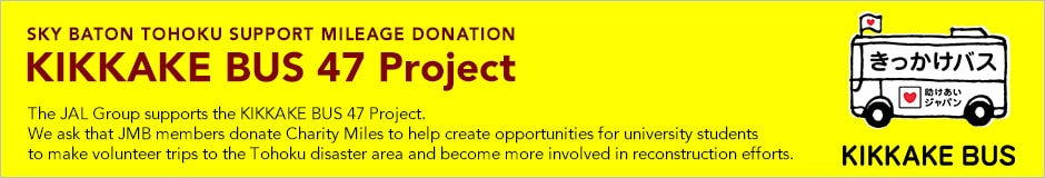 As the first phase of SKY BATON, we will be supporting the KIKKAKE BUS 47 Project organized by Tasukeai Japan, a public interest incorporated association with a proven track record in activities that provide assistance to the disaster-affected areas. The JAL Group will be offering support to this project by providing air transport and will also be asking JMB members to provide their support under a charity miles program.