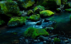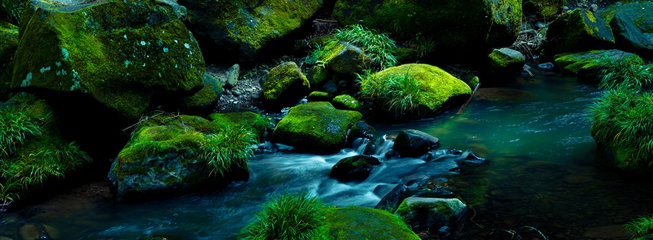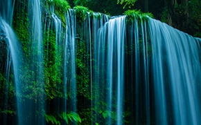 駐車場から滝壺に降りる階段が整備され、比較的容易にアクセスできる鍋ヶ滝。なんとなく軽い気持ちで降りていくとそこには大迫力の滝!まず音に圧倒されます。ここは裏見の滝としても有名なのですが、ドーッという音に包まれながら滝の裏側に入っていくと水のカーテン越しに木々の緑が。最終的にセレクトしたのは滝の表側から撮影したカット。鍋ヶ滝の独特な造形と美しさをまっすぐに捉えました。滝の裏側からの景色はぜひ現地で味わっていただければと思います。しぶきがすごいです。