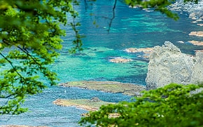 ごつごつとした海岸は滑りにくいので案外歩きやすく、澄んだ水を覗き込むと色鮮やかな藻の間にウニがごろごろ。