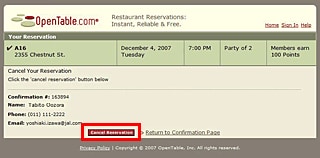 | [予約取消]ボタンをクリックすると、予約の取消確認画面が表示されます。 [Cancel Reservation]をクリックすると、[取消完了]画面が表示されます。 |