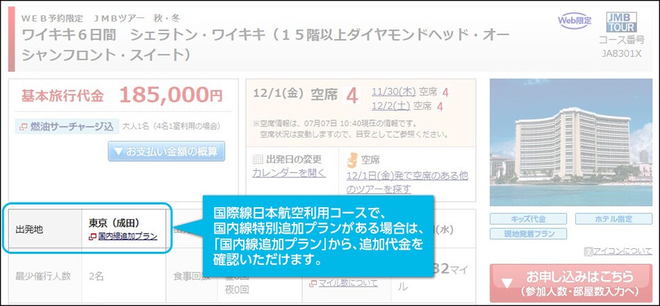 国際線日本航空利用コースで、国内線特別追加プランがある場合は、詳細画面の「国内線追加プラン」から、追加代金を確認いただけます。