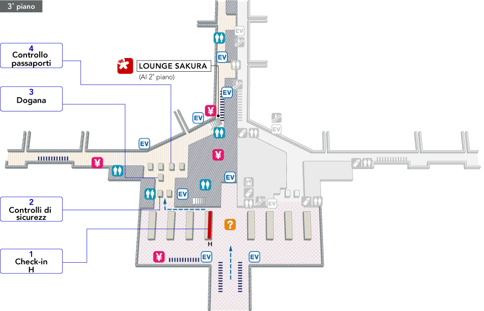 Al piano delle partenze prosegui a sinistra ed esibisci biglietto aereo e passaporto al banco JAL dedicato alla tua classe.