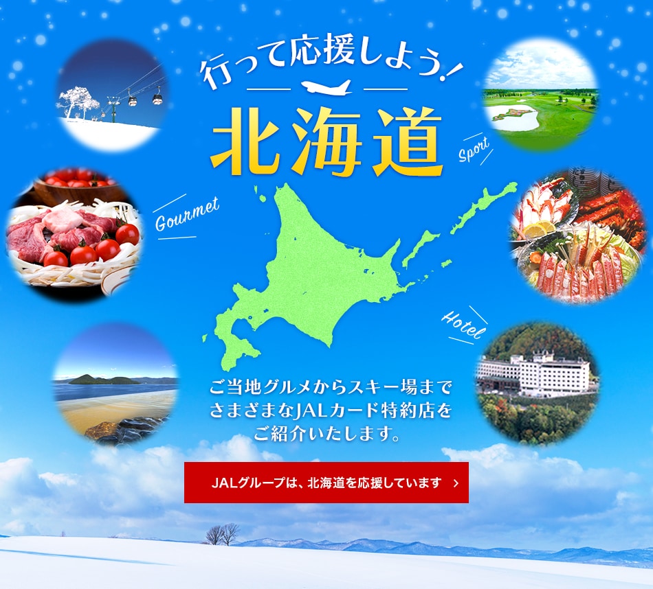行って応援しよう!北海道 JALカード特約店のご紹介 JALカード JALカードのキャンペーン 行って応援しよう!北海道 JALカード特約店のご紹介 ↓北海道のJALカード特約店(一例) 宿泊施設 望楼NOGUCHI登別 ザ レイクビュー TOYA 乃の風リゾート ラビスタ函館ベイ ルスツリゾートホテル&コンベンション ホテル大雪 十勝川温泉 三余庵 小樽旅亭 藏群 江差 旅庭 群来 そのほかの宿泊施設はこちら グルメ・飲食・食料品 山小屋 きょうど料理亭 杉ノ目 本店 札幌 かに本家 札幌駅前本店 Péché Grand そのほかのグルメ・飲食・食料品カテゴリはこちら スポーツ ニセコアンヌプリ国際スキー場 サホロリゾートスキー場 ザ・ノースカントリーゴルフクラブ 北海道ブルックスカントリークラブ そのほかのスポーツカテゴリはこちら そのほかの北海道の特約店をチェックする