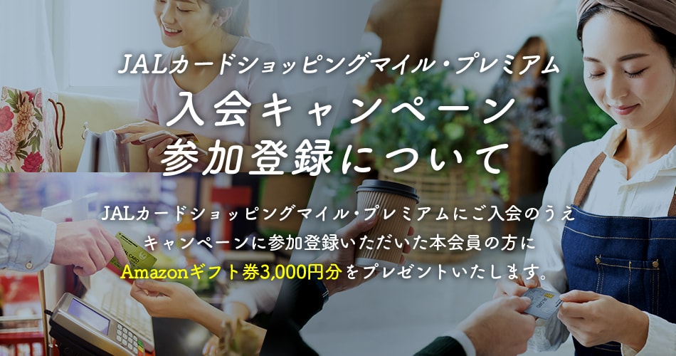 キャンペーン期間中にJALカードショッピングマイル・プレミアムにご入会およびキャンペーン参加登録をされた方にAmazonギフト券3,000円分をプレゼント!