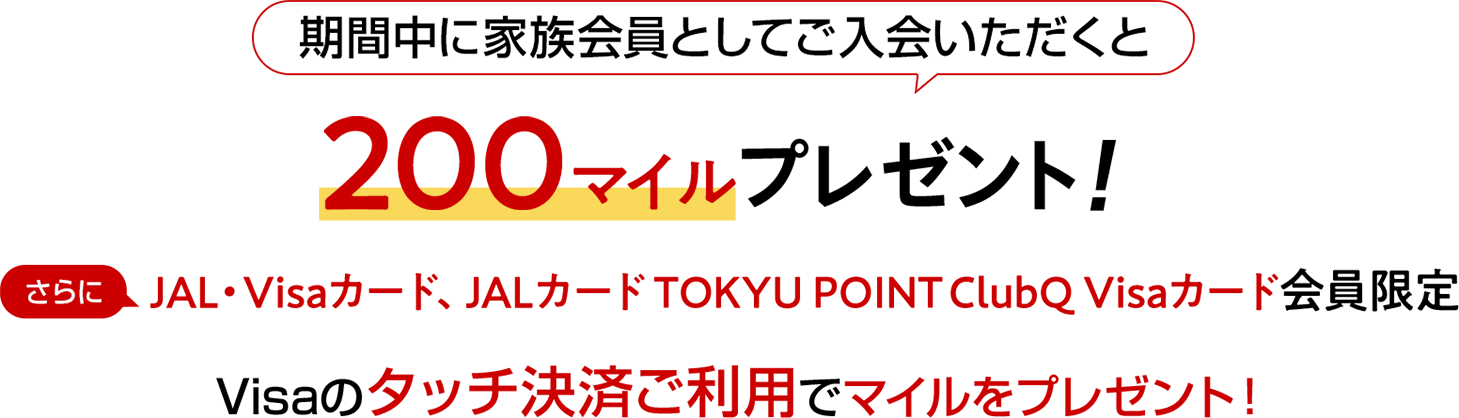 JALカード会員のご家族の方が家族会員として初めてJALカードにご入会のうえ、本会員がキャンペーンに参加登録いただくと、今なら200マイルをプレゼントいたします*。