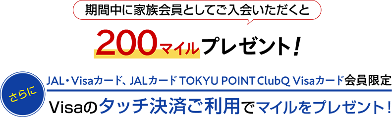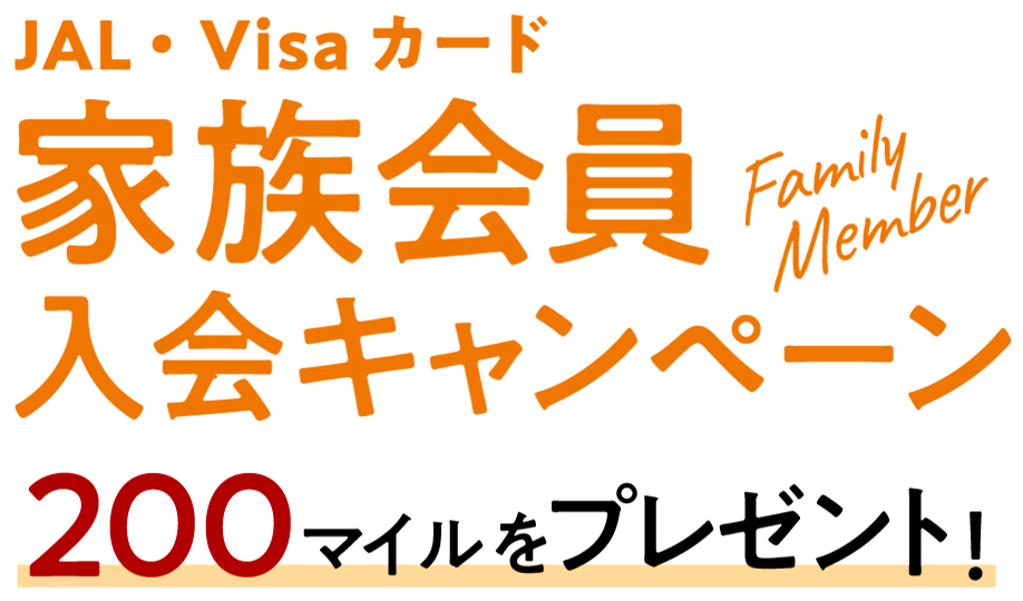 JALカード会員のご家族の方が家族会員として初めてJALカードにご入会のうえ、本会員がキャンペーンに参加登録いただくと、今なら200マイルをプレゼントいたします*。