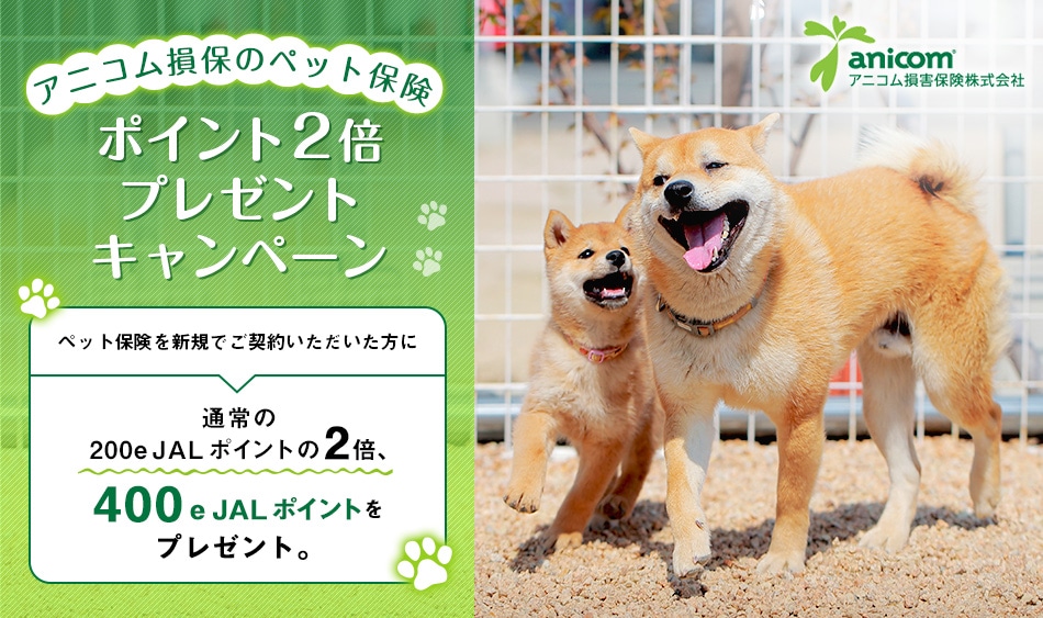 キャンペーン期間中、アニコム損保のペット保険を新規でご契約いただいた方に通常の200e JALポイントの2倍、400e JALポイントをプレゼント。