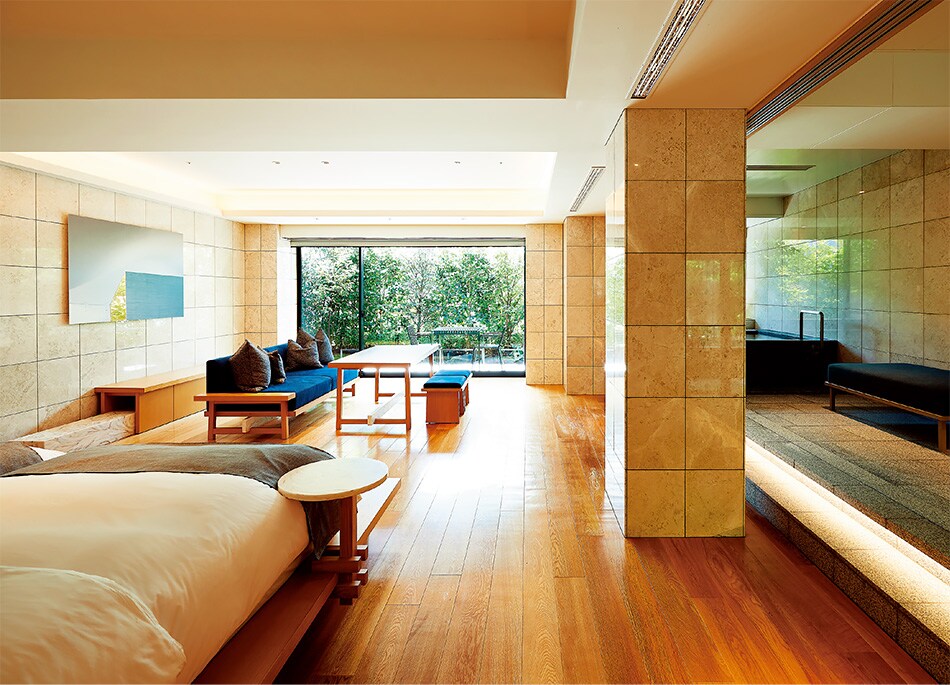 (左上)「ジャパニーズ・スイート」では畳で寛ぎながら専用の庭園を眺めて。