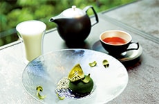 (左下)茶の湯文化を現代的にアレンジしたカフェ&バー「TEA AND BAR」では開業3周年を記念したシグネチャースイーツ「奥庭~OKUNIWA~」が楽しめる。