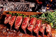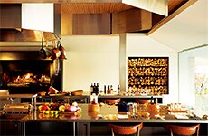 (左下・右下)メインダイニング エレテギアでは、料理長を中心にきびきびとしたスタッフの、臨場感溢れる調理工程も見どころ。地元の漁師や農家から仕入れる旬の素材を使った薪火料理が人気。