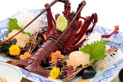 伊勢海老の活造りと伊勢海老のサラダの両方を味わえるコース「招福」。伊勢海老の中納言焼は、鮑の蒸し焼または国産牛フィレ肉の石板焼にアレンジしてもらうことも可能だ