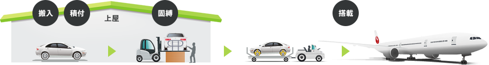 航空機内に自走して転回させるような危険な作業を避け、上屋内にて十分なスペースを確保し、安全に自動車を専用器材に積み付けます。